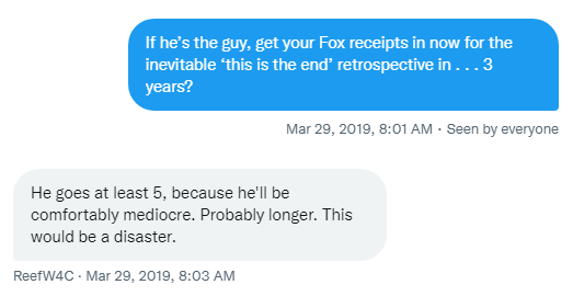 Well, here we are. I predicted Fox would be fired in three years. Reef went with five. The correct answer ended up being 4 years. The wisdom of crowds strikes again.
