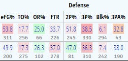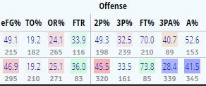 Again, year over year Cal’s stats are pretty steady. If you squint, maybe Cal got a touch better at securing defensive rebounds and defending without fouling, but for the most part this is a very similar chart, except for one huge glaring problem: