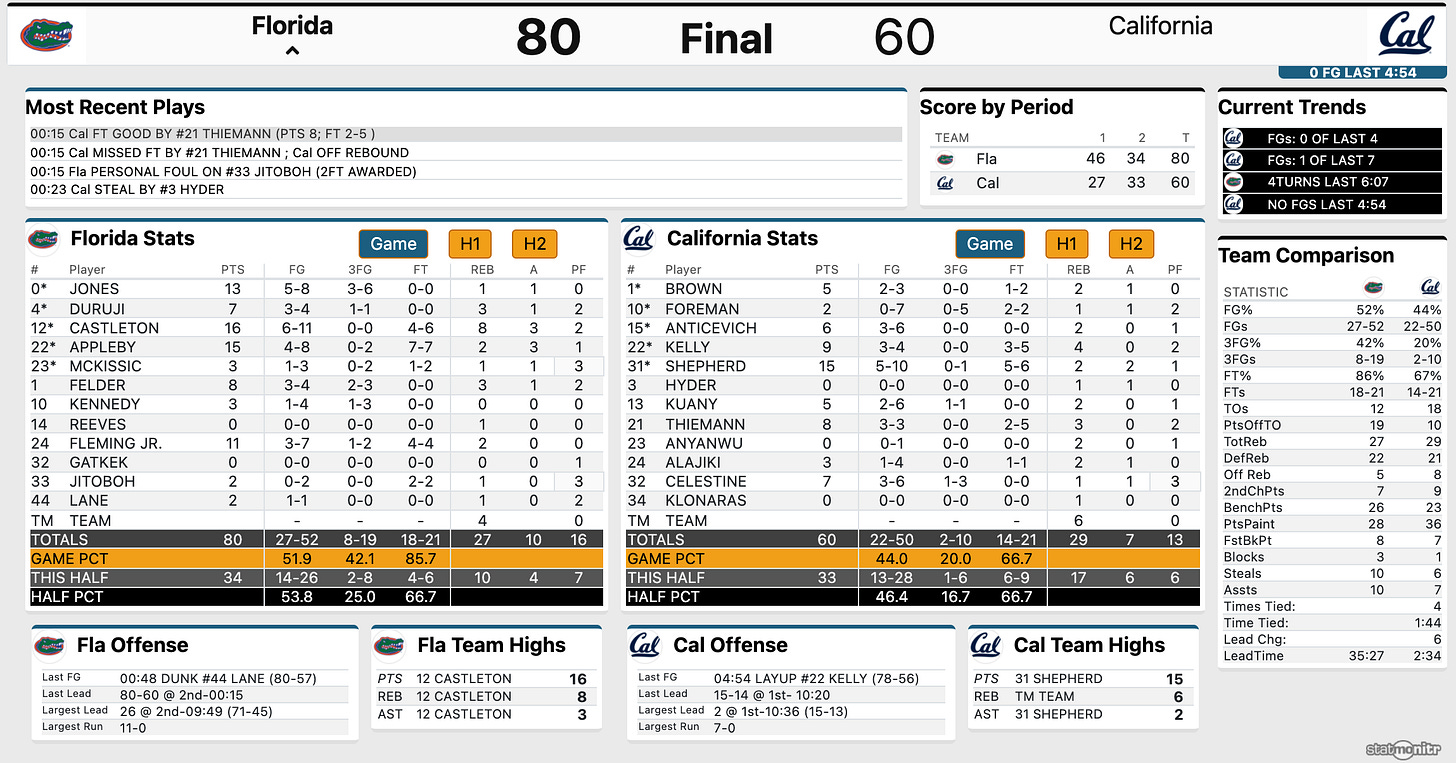 Cal would score back but not enough until the deficit ballooned to 19 by halftime. Florida would score 20 consecutive points on offense in the final 5 minutes of the half, without missing another shot attempt or free throw.