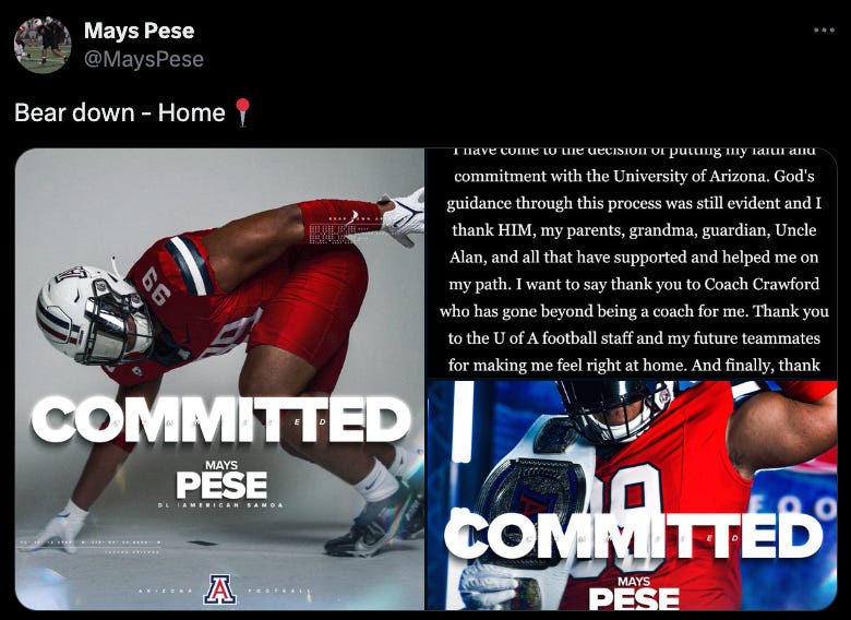 Prep recruiting continues to get more competitive, as Cal has lost yet another 2025 commit. Defensive line prospect Mays Pese (who only committed a few weeks ago) flipped his commitment to Arizona.
