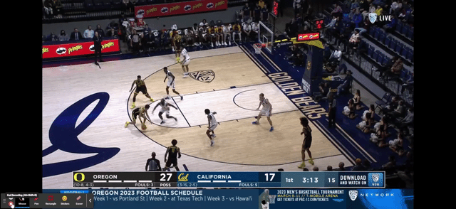 Notice how all five Cal players are moving with purpose. They are using the entire frontcourt, operating at a good speed. Newell’s cut at the end that resulted in a foul and 2 free throws was available at the very beginning of the sequence as well. In my notes, I jotted down, “good motion from everyone.” It did not continue.