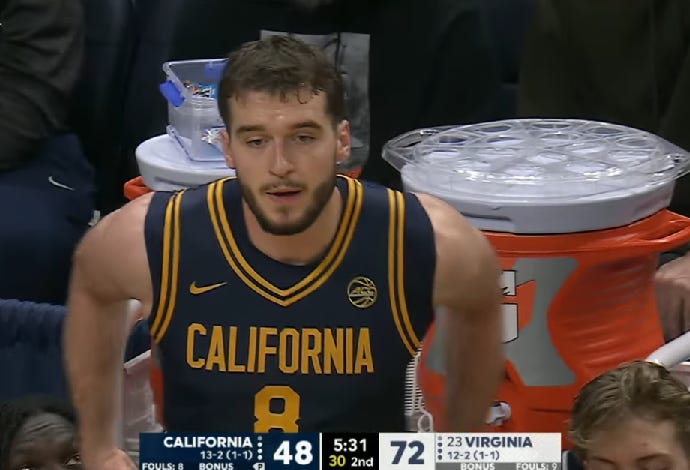 Cal was presented with a tall task tonight. The 23rd-ranked Virginia Cavaliers are a deep, well rounded team led by their frontline tandem of Thjis De Ridder and Johann Grunloh. The Cavaliers are 4th in the nation in blocks per game (6.3), and have seven different players who have led them in scoring. It was a homecoming game for Dai Dai Ames, who played for Virginia last year. Could John Camden snap out of his 2-game funk? Would Cal avoid an early game slump and be competitive across 40 minutes?