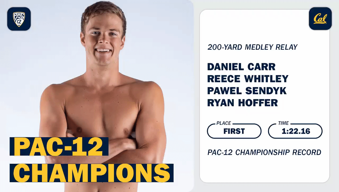 As if one podium sweep weren’t enough, Ryan Hoffer, Pawel Sendyk, and Michael Jensen followed suit in the next event, the 50-yard freestyle. Hoffer’s and Sendyk’s times of 18.87 and 18.91, respectively, are now the two fastest times in the country for the duo that completed the exacta in this event at last year’s NCAA Championship. Congratulations to freshman Marcos Rico Peng for his milestone-beating personal-best time (19.84) en route to his C-final win. Sprint on you Bears!