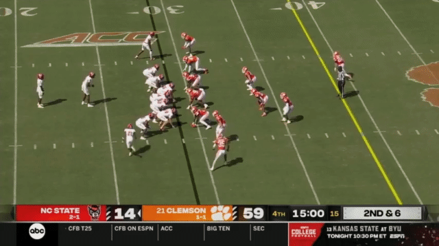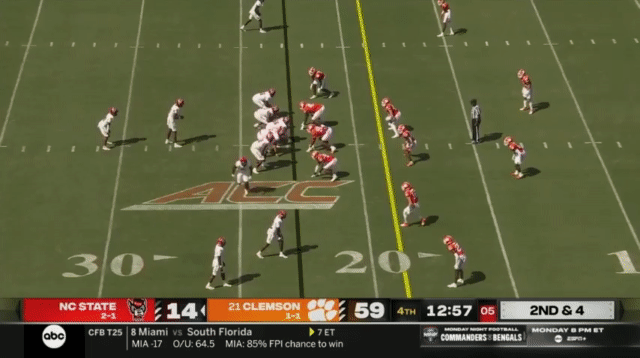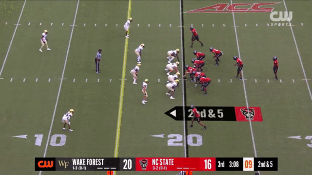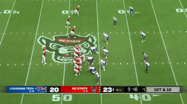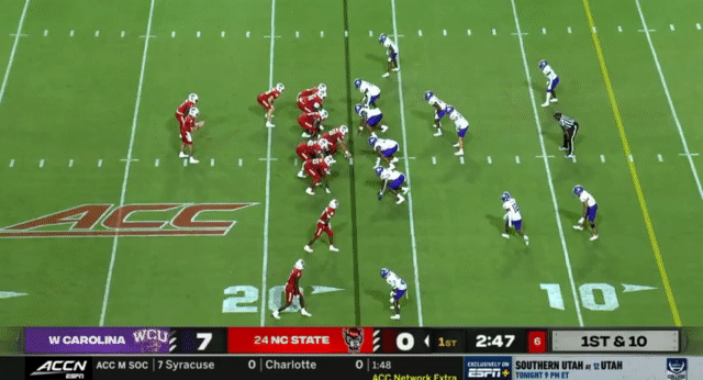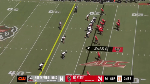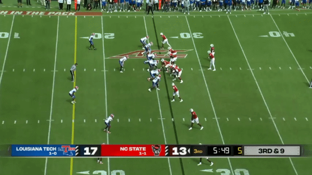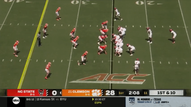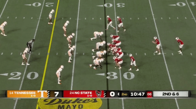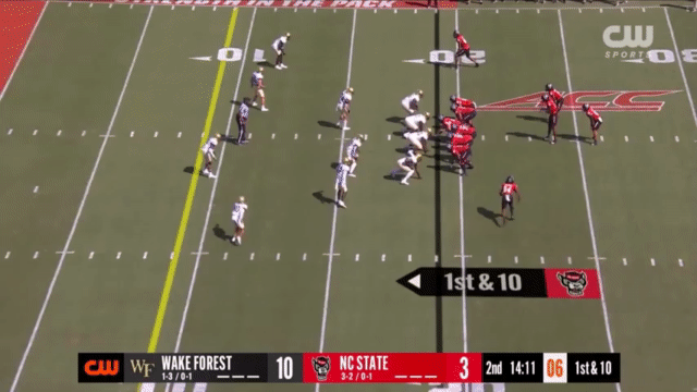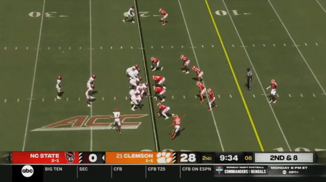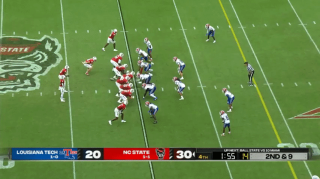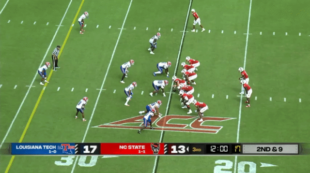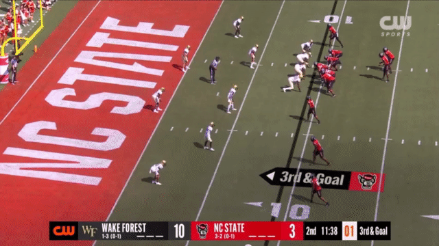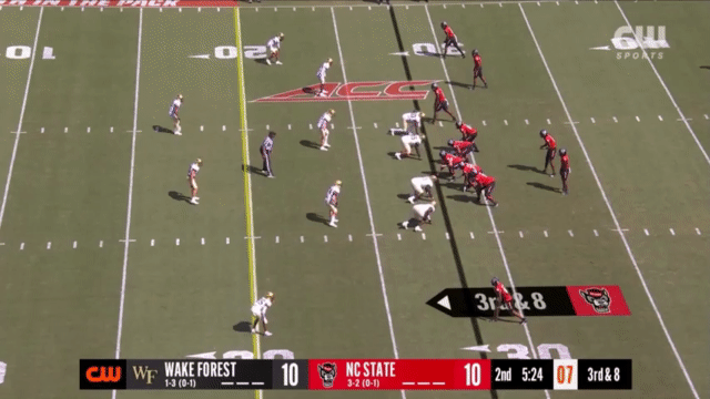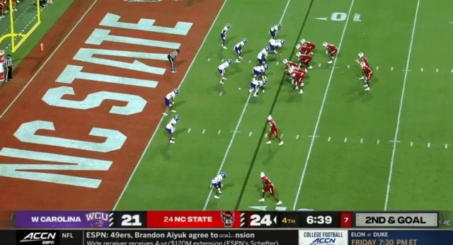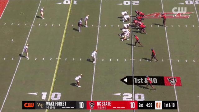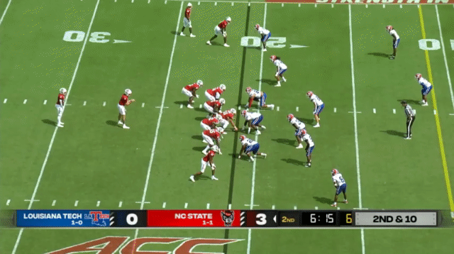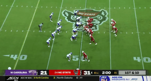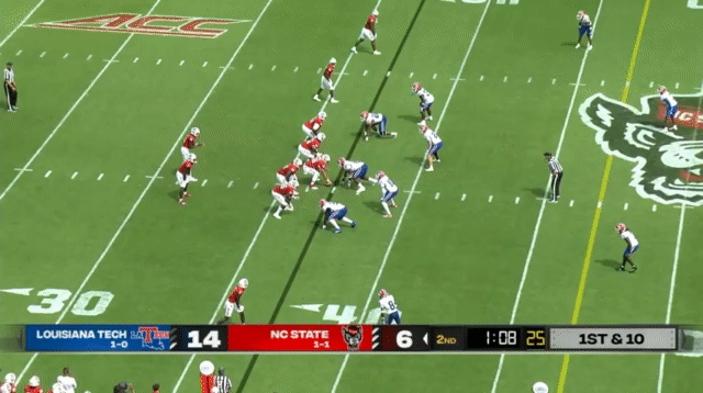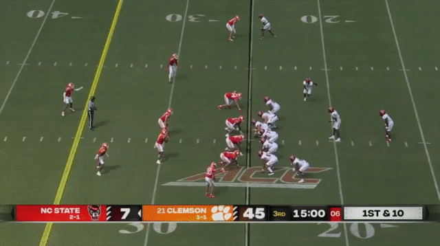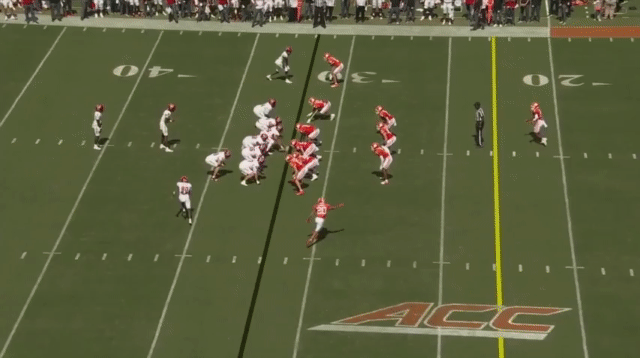 NC State will often run running backs out into the flat as both a check-down receiver and to spread the field horizontally. Here Waters gets the ball in space and almost breaks off a big play: