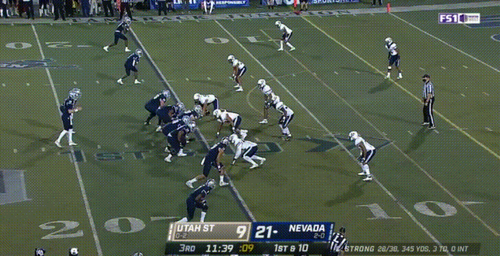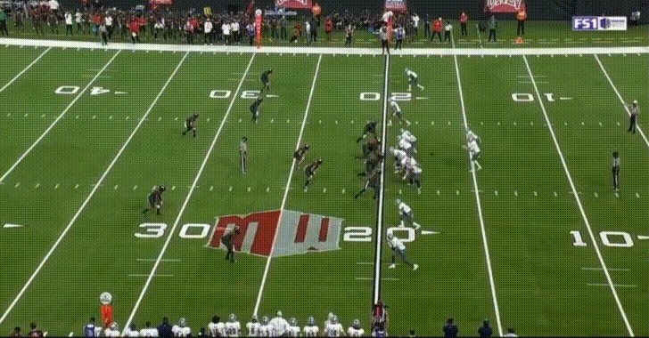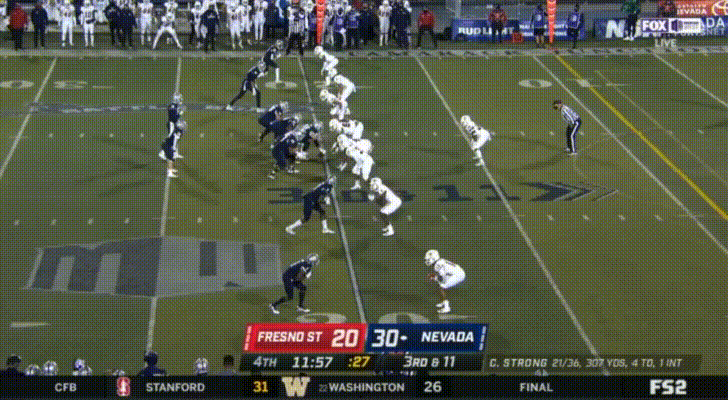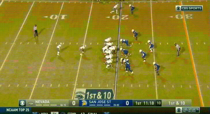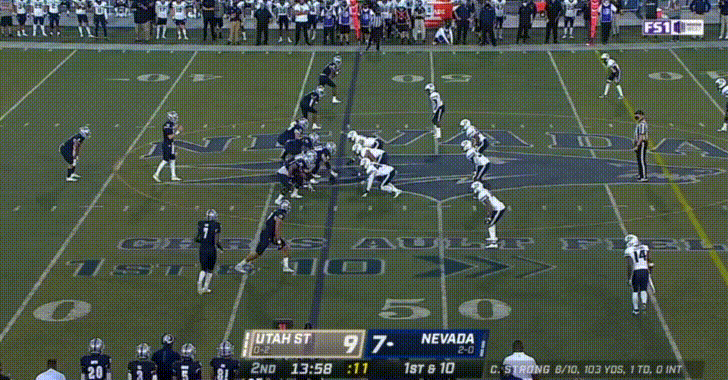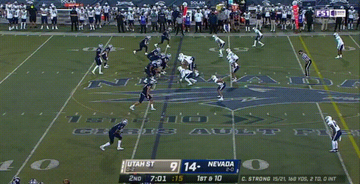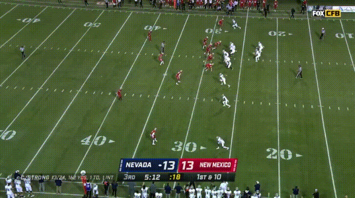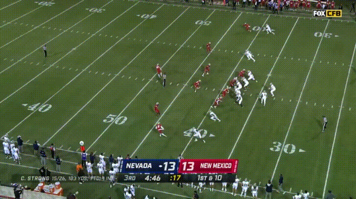 The Nevada offensive line isn’t particularly good, but they only need to give Strong good protection just a handful of times in order to allow him to make deep shots like this. A very big percentage of Strong’s yards come through plays like the one above. Nevada will throw a screen pass, screen pass, bubble screen, tunnel screen, then BANG - a 60 yard bomb. As long as the offensive line can hold up for a couple seconds and give Strong a clean pocket, he can sometimes deliver an accurate strike down the field.