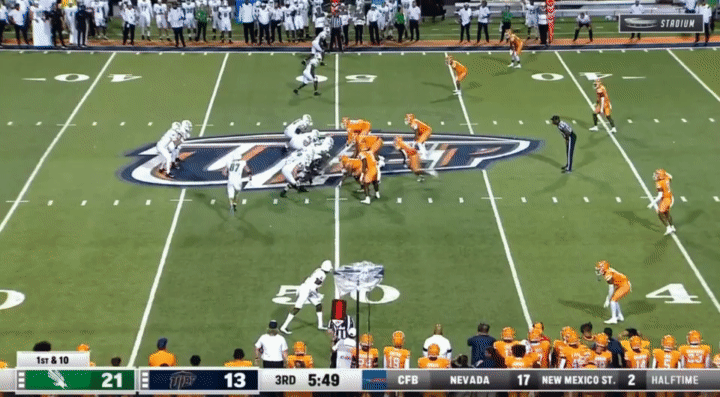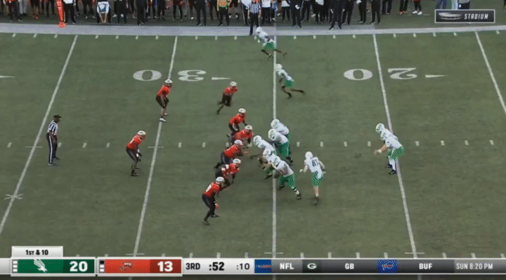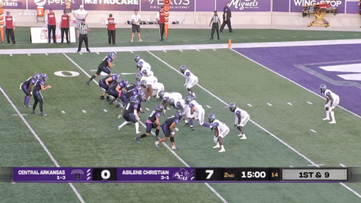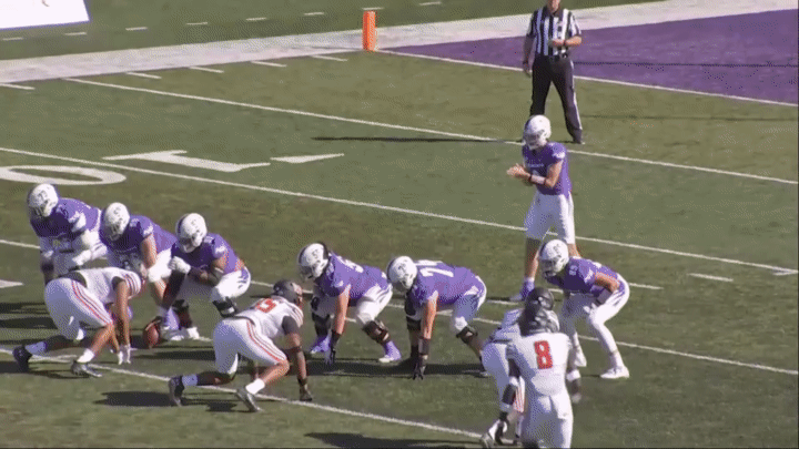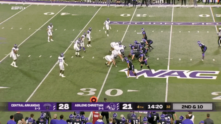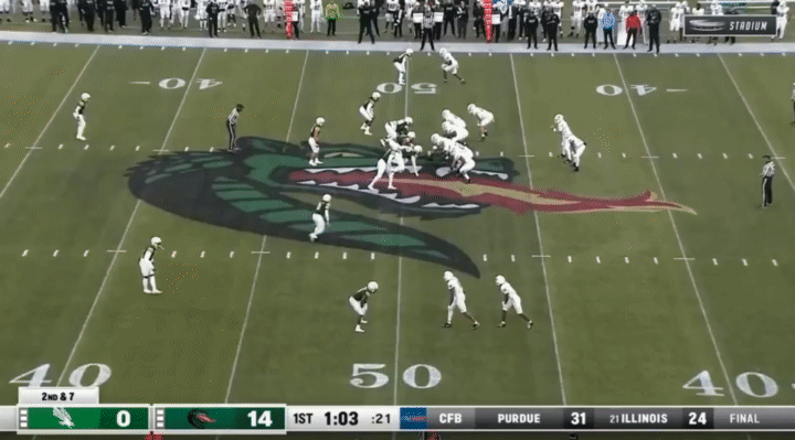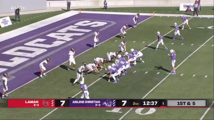 North Texas is expected to start former Abilene Christian transfer Stone Earle. Admittedly, I wasn’t able to find too many Stone Earle ACU games, and he mainly played a handful of change-of-pace snaps last year for North Texas, so I don’t have a ton of tape to go on here. But my general impression of Earle was a quarterback that almost looked more comfortable running the ball than throwing it. Both ACU and North Texas used Earle in designed runs and QB draw plays, often using misdirection on the run. Here ACU lines up with 5 receivers for the designed QB run: