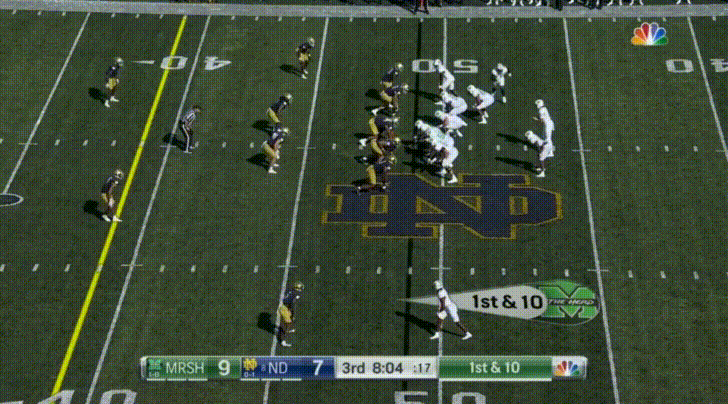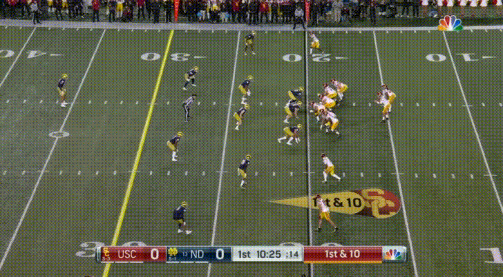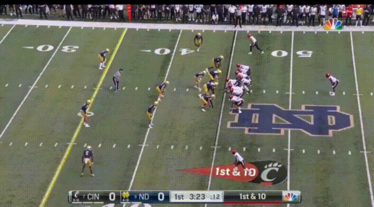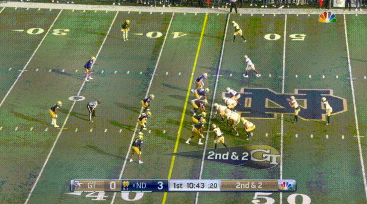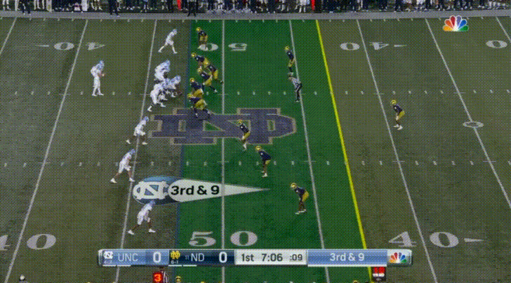 Notre Dame typically runs a variation of a 4-3 defense, with two defensive tackles bookended by a defensive end and what Notre Dame calls the “Vyper.” The Vyper is essentially a stand-up defensive end who can drop back to linebacker when necessary. They also have a position called the “Rover,” which is similarly a hybrid linebacker/safety. Not surprisingly, this is where Notre Dame likes to play some of their most versatile athletes.