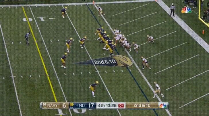 At the “Rover” position—the hybrid linebacker/safety—is Jack Kiser. These sorts of hybrid positions suit the Notre Dame defense well, because they tend to have a lot of “tweener” type recruits— say, an undersized linebacker who is great in coverage, or a big defensive back who is great in run support.