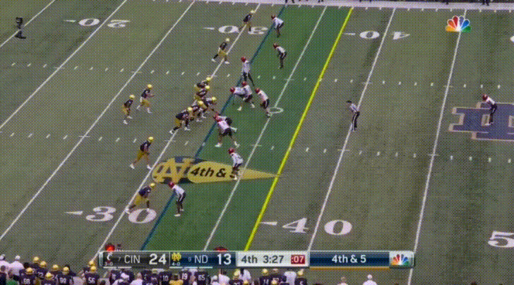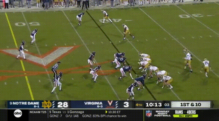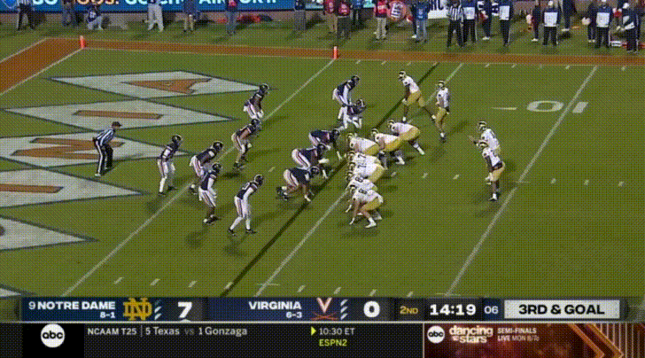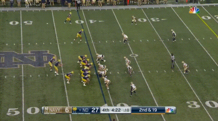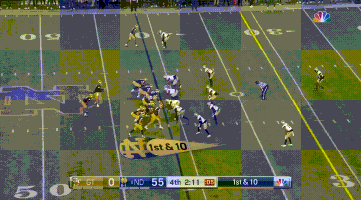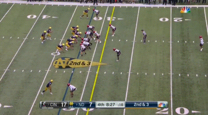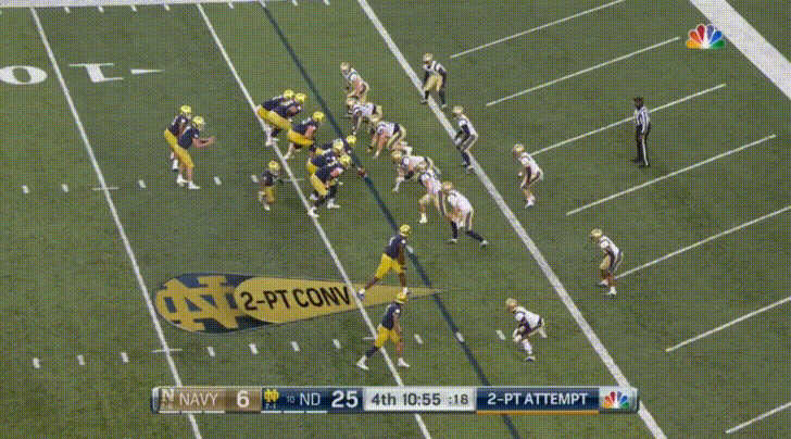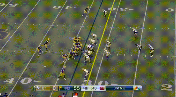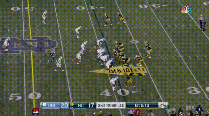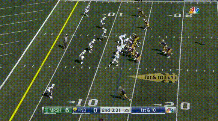 Consequently, ND loves to get Tyree the ball in space, and so he’s frequently used on swing passes as an extension of the run game (and to stretch the field horizontally). Because of his size, though, he’s not relied on for more than cut blocks, and he’ll frequently look to bounce runs outside (where he can use his speed).