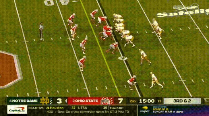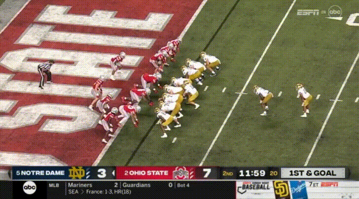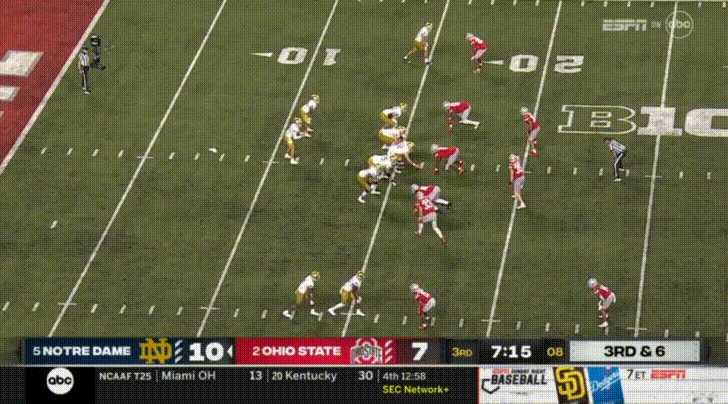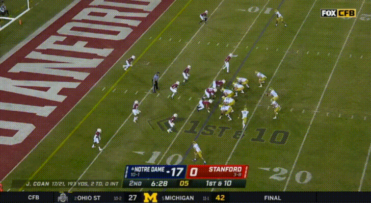 [Second, less-quick note: The reason I wasn’t paying close attention to the receivers is that I was actually hyper-focused on Notre Dame’s offensive line, which I thought would be a bigger story or focal point to this game (especially if Cal still had Brett Johnson). The reason Notre Dame had early season struggles against lesser teams was their disastrous offensive line, which they didn’t really figure out until the USC game. Consider this stat line— in the first 5 games, ND had 80.8 rush yards/game, 0.8 rush TD/game, 4.4 sacks allowed/game. Final 7 games: 204.1 rush yards/game, 2.7 rush TDs/game, 1.6 sacks/game. By now, the offensive line has stabilized, with 5-star sophomore tackle Blake Fisher picking up the slack. However, ND is very thin here. Backups like Tosh Baker, Michael Carmody, and Andrew Kristofic were beat like drums last season, with ND’s offensive line stats residing in the bottom 10 of FBS last season. I think LT Joe Alt and RG Josh Lugg are exploitable, but I’m not sure Cal’s defensive line has the horses to challenge them.]