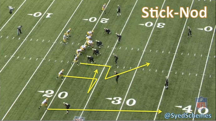 The answer to that counter is the stick-nod route which takes the simple stick route and turns it into a double move inside and the flat route turns into an inside breaking route to run into the space that the double move vacates. The LB covering the stick either runs with the double move opening up the space or stays in his assignment leaving the double move open.
