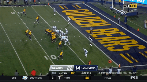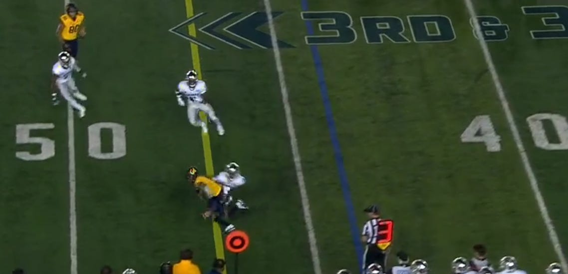 Again, we can see the stick route getting in the way of the two defenders off the snap. Nikko is wide open for a 1st down even if #8 recovers Nikko would have the 1st down. However, in this case, Nikko failed to keep possession of the ball, and the tackle by #8 jars it loose for an incompletion. If Nikko were to hold onto the ball it’d be 1st down Cal.