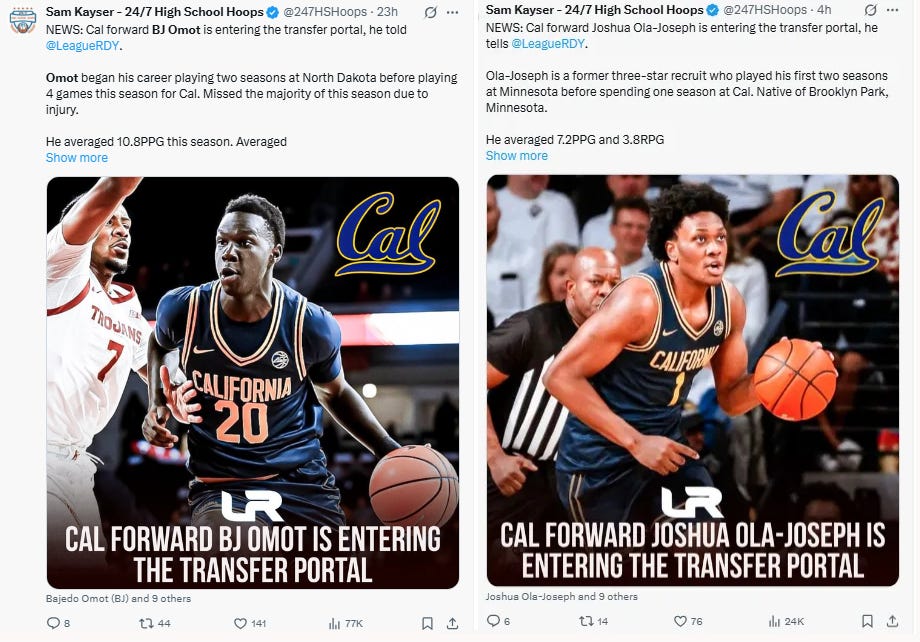 Christian Tucker, Jovan Blacksher Jr, and Mady Sissoko are out of eligibility. Three players have entered the portal. Cal has 4-star recruit SG Jovani Ruff and 3-star PG Semitri Carr joining the program this fall. As of now, there are 4 scholarship spots open. Over 200 players had already entered their names into the portal on the first day, providing Cal with options to target before the portal window closes on April 22nd.