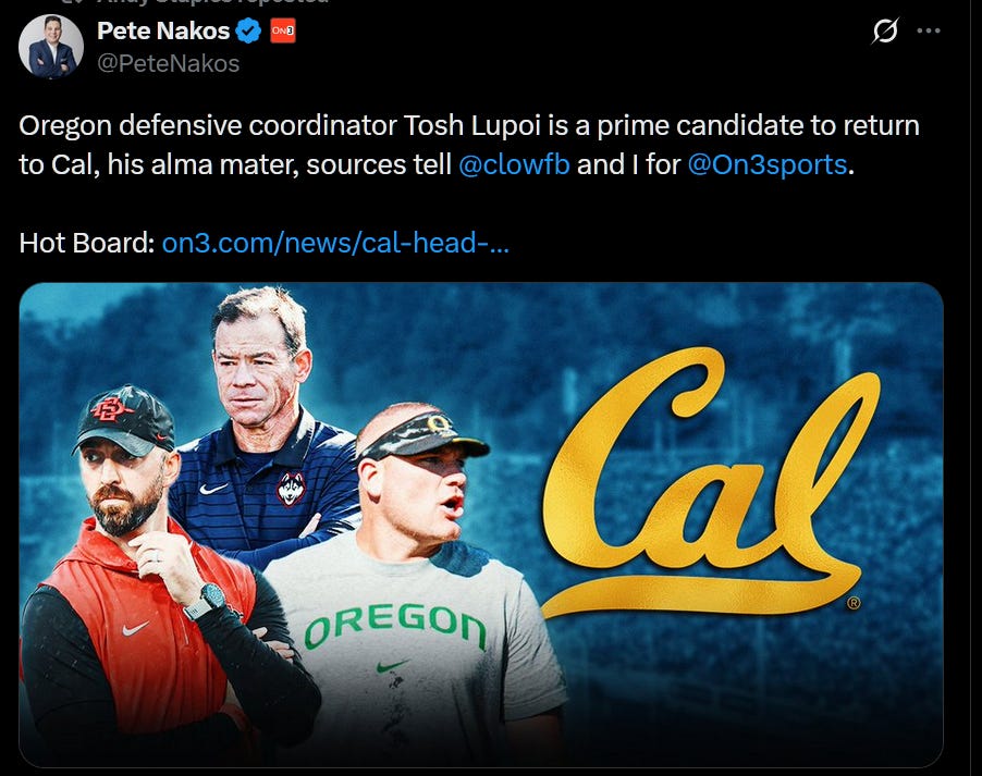One more thing in the coaching carousel. By the way, Cal fired Justin Wilcox. They are going to hire Tosh Lupoi, that’s pretty much all we need to say.