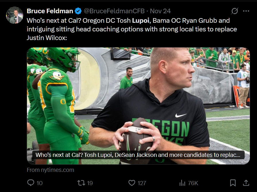 Now, this was dropped in-media-res of a podcast, and it strikes more of a “we think that Cal’s coaching search is zeroing in on Tosh and it has been the intent of the administration to do so.”