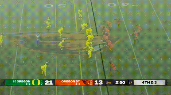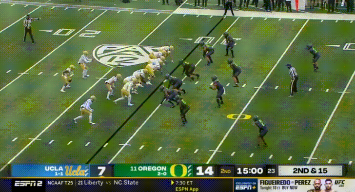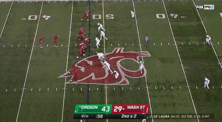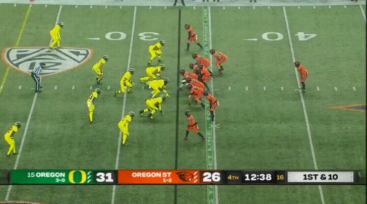Lastly, I feel like the hybrid “Stud” position belongs here, since Oregon’s stud position functions more like an outside linebacker. I don’t have a very strong opinion on their Stud LB Mase Funa. I do remember he had a couple nice sacks against Nevada last year after Oregon put their backups in (up by 63 points or something). The Stud in Oregon’s defense functions primarily as a pass rusher first, but Funa has yet to record a sack this season. He’s another versatile type of linebacker, able to pass rush or drop into coverage, but he hasn’t made too much of an impact this year.