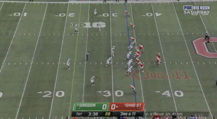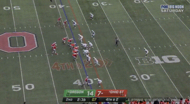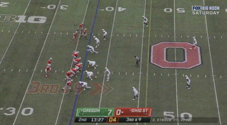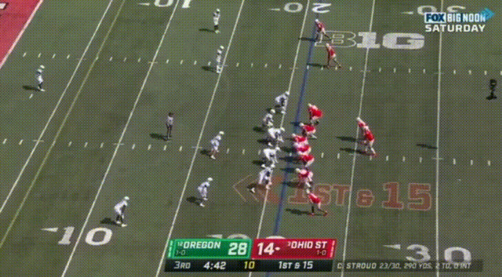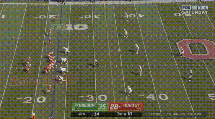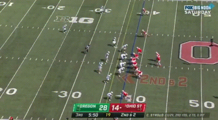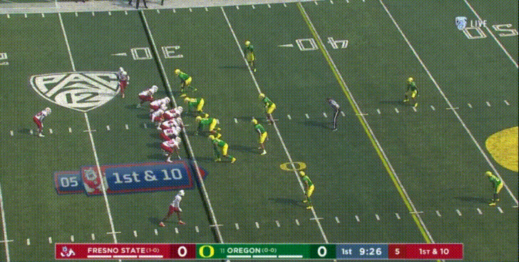 There’s no better way to start this preview than with a closer look at Kayvon Thibodeaux. Every team will be specifically game-planning around Thibodeaux. He has been a monster since his freshman year, with that rare combination of size and speed where he’s too fast for strong guys and too strong for fast guys, and hence why NFL teams are drooling over him. When everyone was healthy (say, on one of the first drives in the first game of the season), Oregon did look like an absolutely elite defense. Take this play for example: