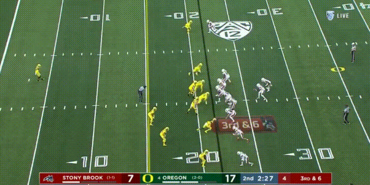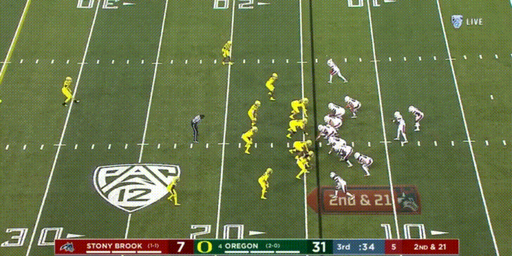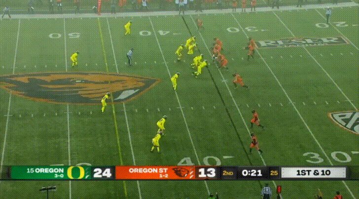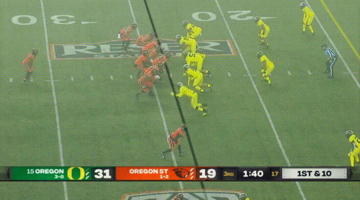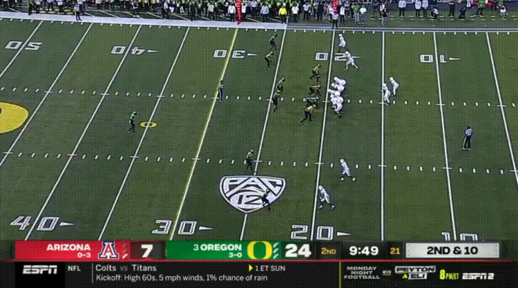 Thibodeaux bursts through the line between two blockers, smashes the quarterback to force a fumble, and Oregon recovers it with excellent field position. The quarterback is trying to make a quick throw, but he doesn’t even have time to do that. That’s fast.
