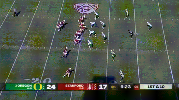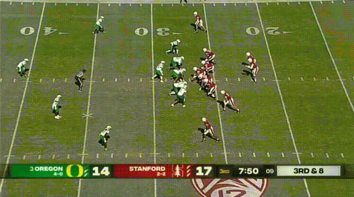 Oregon has a number of real athletes in their secondary. My favorite is probably the corner Mykael Wright, an explosive play-maker that will also show up in special teams. He’s got tremendous speed, preventing speedy receivers from blowing past him, and he also used his physicality to defend against Stanford’s big-body receivers: