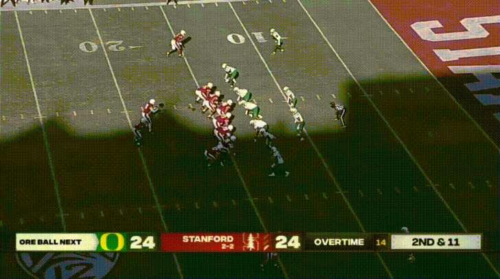 Thibodeaux eats the double team from Stanford’s two best offensive linemen, but still manages to drive them back enough to force QB Tanner McKee out of the pocket and improvise. That’s power.
