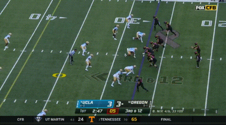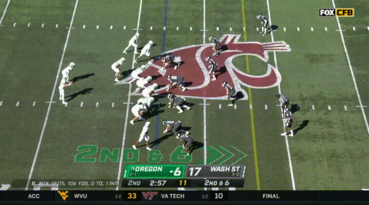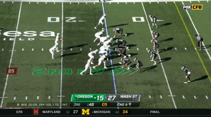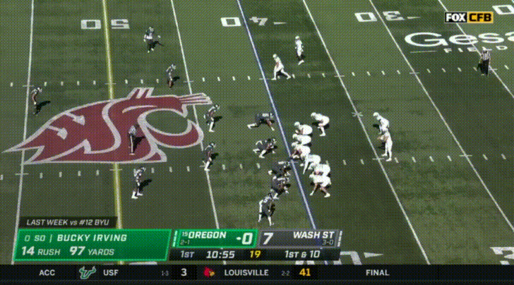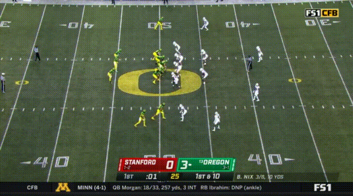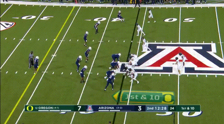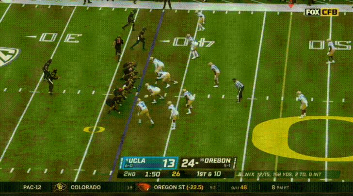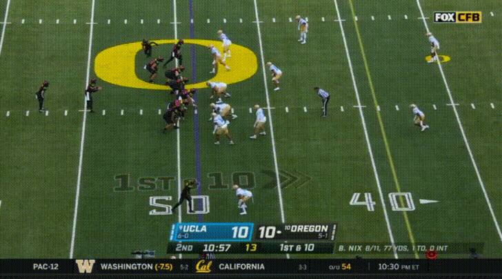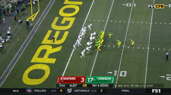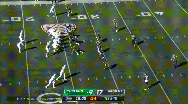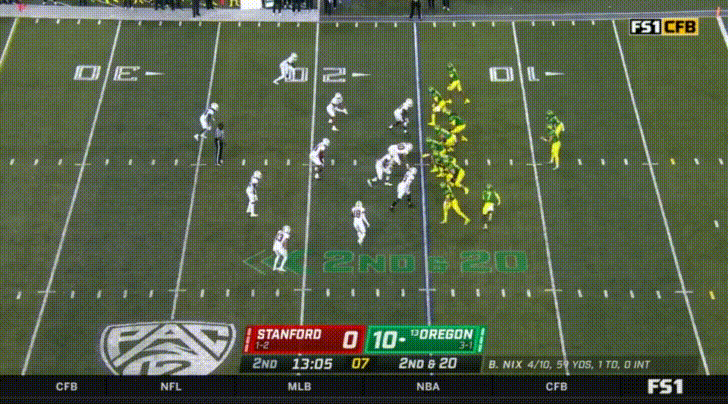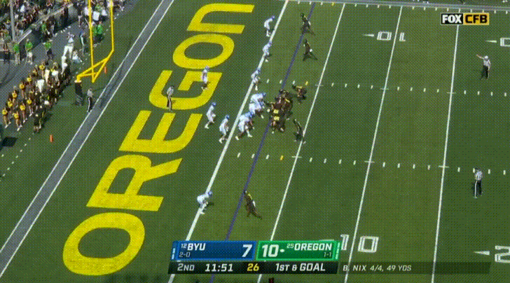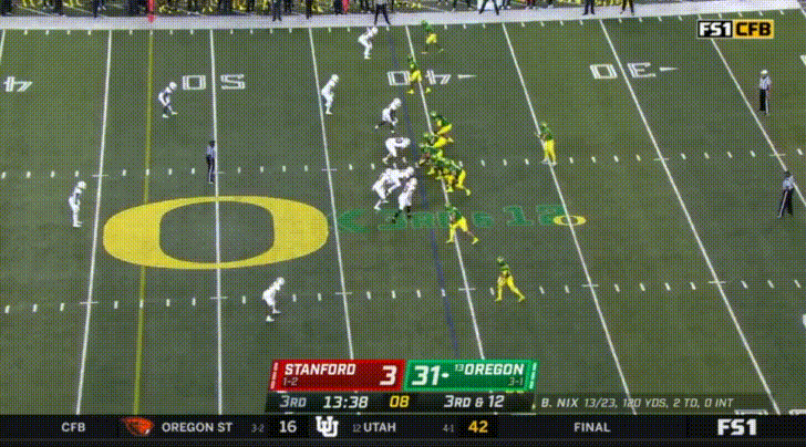 Because Oregon runs the ball so well (and I mean the running backs too), defenses will commit defenders to stop the run, which often leaves their corners in man coverage. Here, the threat of the run (on the play action) sucks the defense in, before Nix launches it deep to his deep threat receiver: