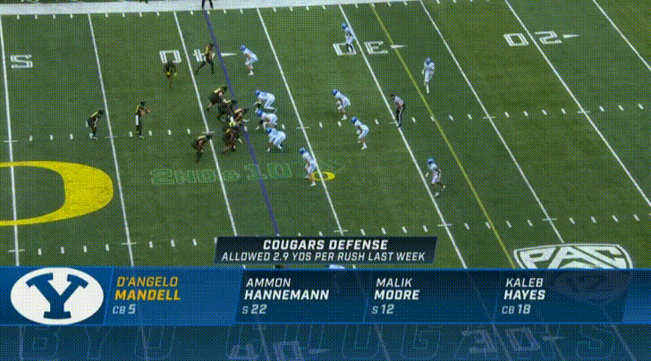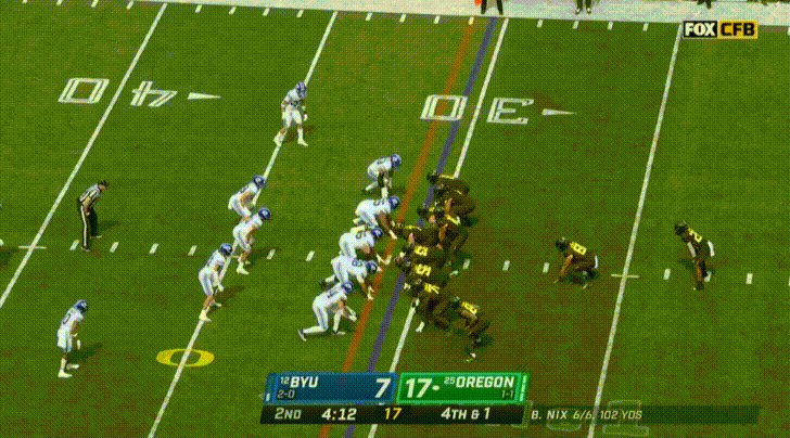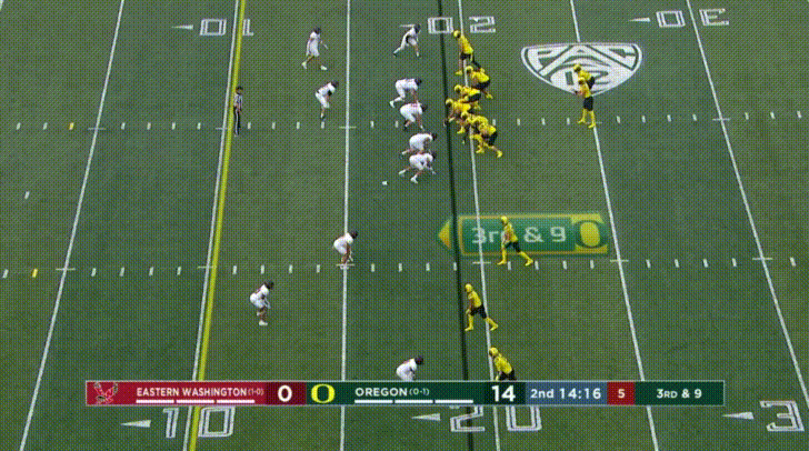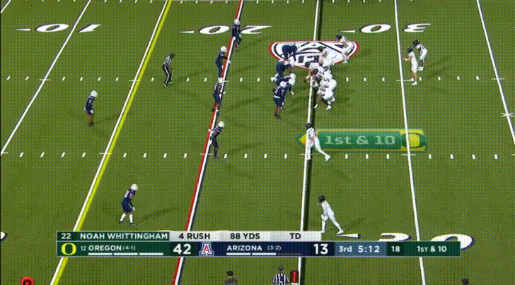 In short yardage situations, Oregon turns to the true freshman RB Jordan James. The following play is one of the few times the running back didn’t get a good block at the line, but James willed his way to the first down anyway: