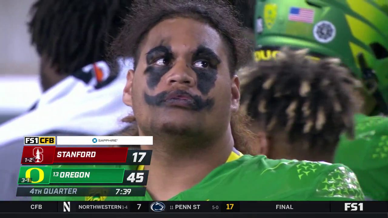 Up first: Oregon. Dan Lanning may have been the defensive coordinator for one of college football’s all-time great defenses (2021 Georgia), but it’s the Oregon offense that’s turning heads. They currently lead the Pac-12 in both yards per game and points per game, and they’re 5th in the FBS in rushing offense (and 3 of the 4 teams above them are service academies that run the triple option). They lead the FBS in fewest sacks allowed, with just one sack in their 7 games. And this is the sack: