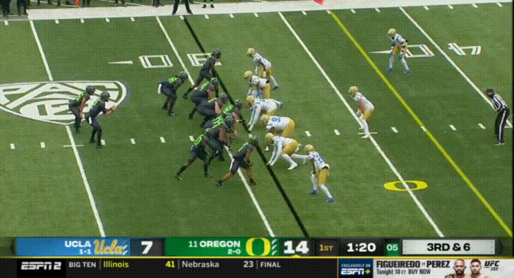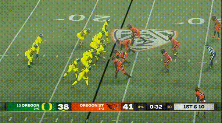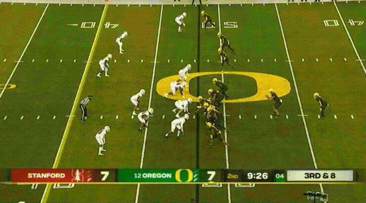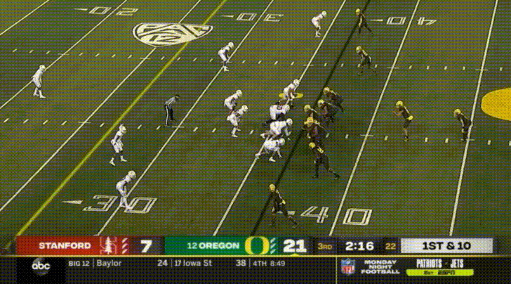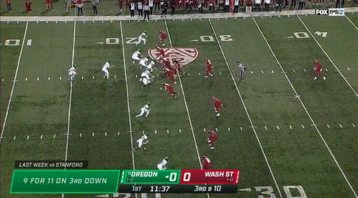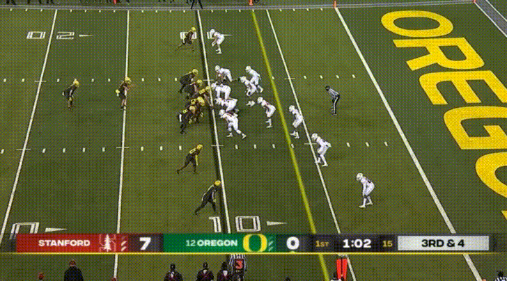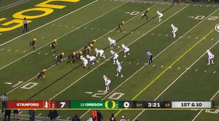 Here, Oregon uses Verdell to stretch the field horizontally, and he gets some good blocks from the wide receivers to get the first down.