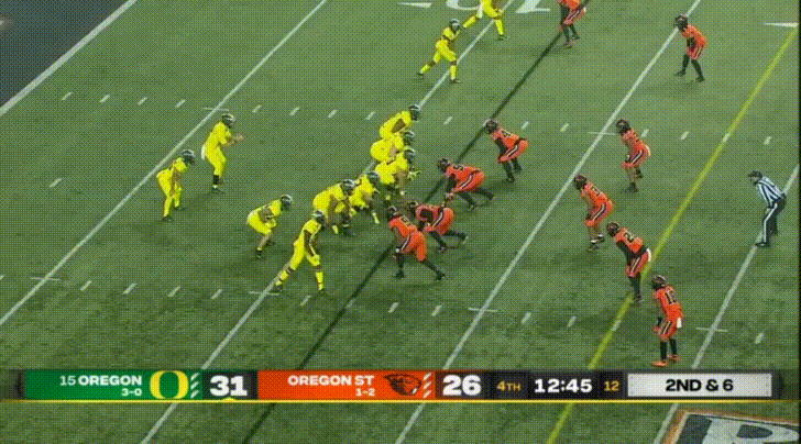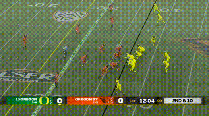 It’s also worth pointing out that Jaylon Redd is also used in the Oregon run game, frequently running the ball on jet sweeps like this one (this looks like a handoff, but these are sometimes “passes” when the QB flips the ball forward like he’s supposed to, to eliminate fumbles):