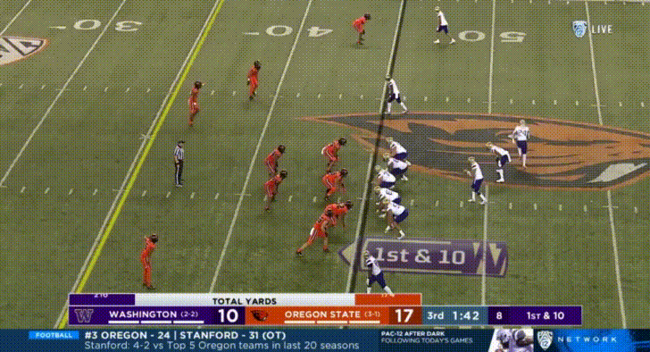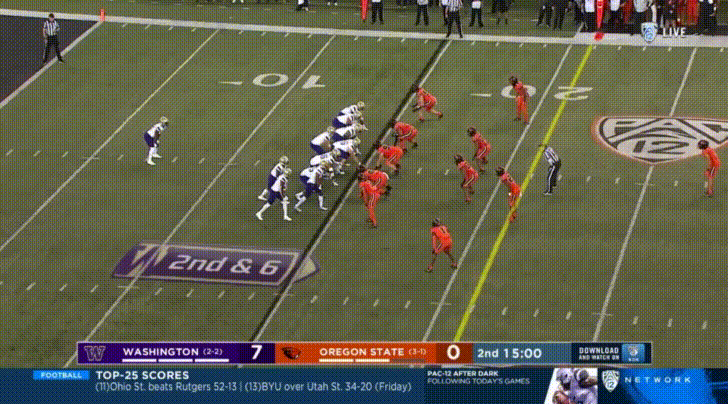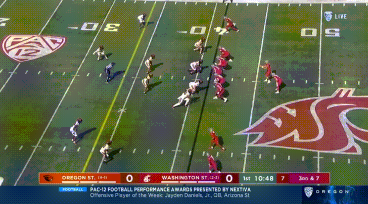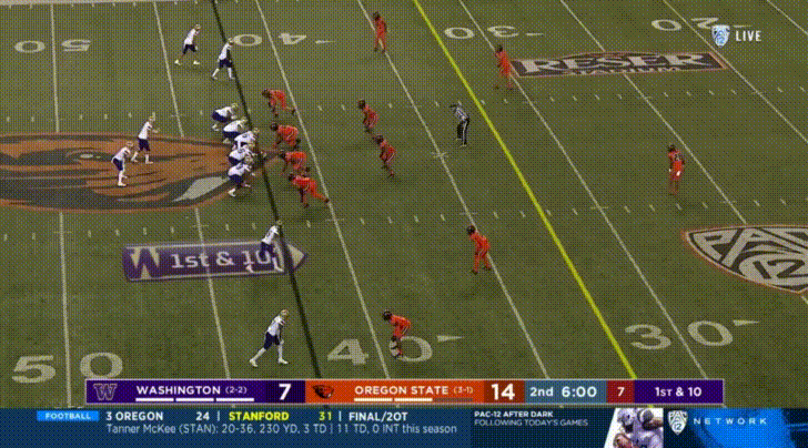 The only other player that has stood out to me on the OSU defensive line is the freshman defensive end, Sione Lolohea. Even though he’s played just a quarter of OSU’s defensive snaps, I have noticed him more than anyone else on the defensive line. The fact that he’s a disruptive force as a freshman means he’s only getting started. Here, Sione Lolohea stuffs the Washington run, which gives NB Jaydon Grant the opportunity to strip the ball, with the fumble recovered by CB Rejzohn Wright: