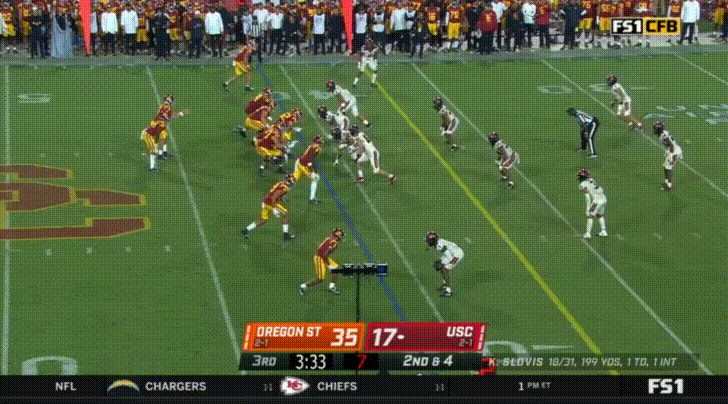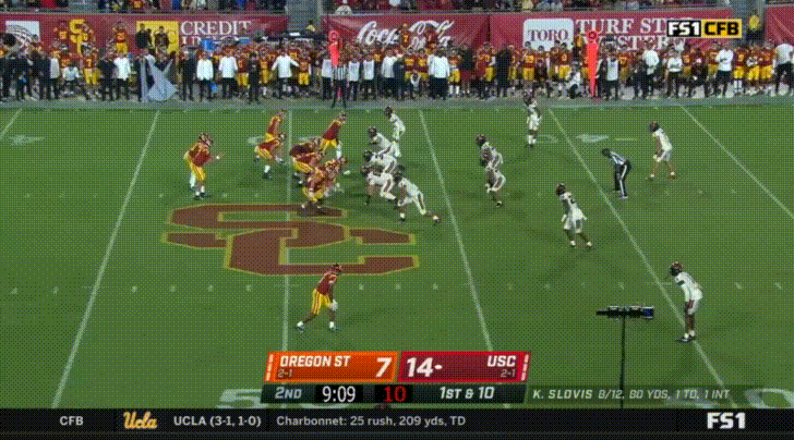 And because I spent so much time talking about him yesterday, I’d be remiss if I didn’t also include OSU’s two-way player, LB Jack Colletto. He’s one of the backup linebackers, but he’s shown up in a couple big plays (an interception, a forced fumble, etc). Here he is dropping into coverage against QB Kedon Slovis: