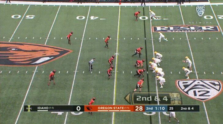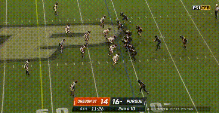 Their best defensive lineman for the past couple years was probably Isaac Hodgins, but he hasn’t played this season after foot surgery over the summer. Oregon State usually plays with three down linemen, but they rotate snaps pretty frequently amongst them. Defensive end Simon Sandberg has the most snaps of anyone on the defensive line, but according to PFF, he’s only playing roughly 55% of snaps. Honestly, I haven’t seen enough of DT Thomas Sio, DT Alexander Skelton, DL Keonte Schad, DL Cody Anderson, or DL James Rawls to tell you any real insights of them (and honestly, it’s pretty notable to me that absolutely none of these defensive linemen have stood out or distinguished themselves in any way). There are only two defensive linemen that have stood out to me. The first is defensive end Simon Sandberg (a Swedish native!), who has shown some decent pass rush ability:
