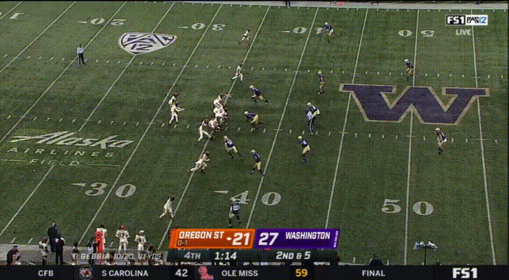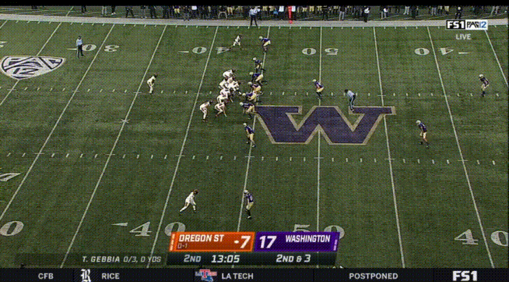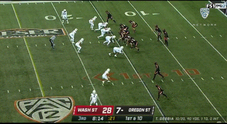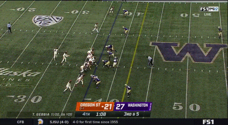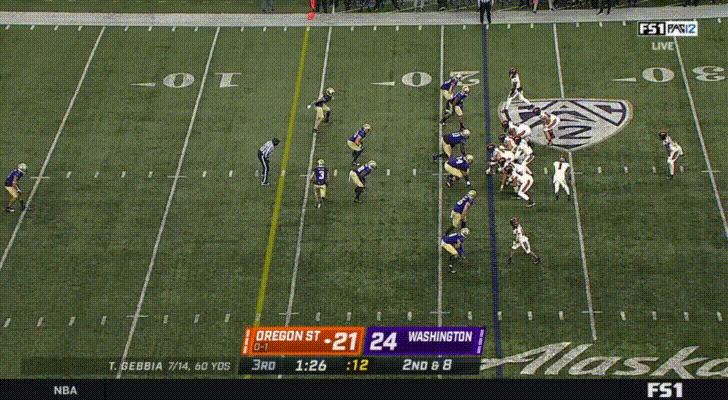 You might say it’s unfair to take a bunch of clips from the Washington game instead of the Washington State game, but I don’t really find it all that interesting to watch a bunch of 10 yard passes to wide open receivers against a bad secondary. I think the Washington game is far more representative of what we can expect from Gebbia.