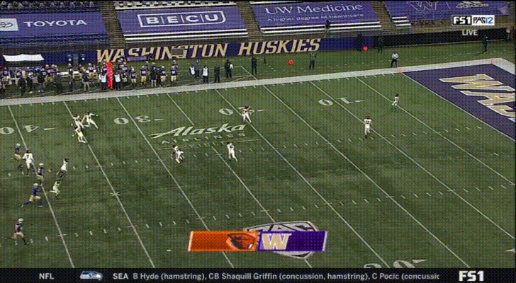 The only time I saw him tested was last week’s final drive against Washington. Here’s him trying to make a difficult throw in a tight window:
