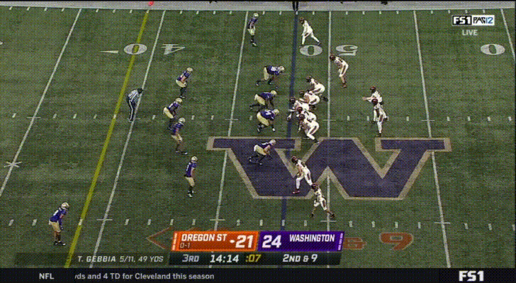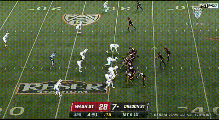 One thing I do like about Gebbia is that he does have nice mobility in the pocket, stepping up to avoid pressure when appropriate, but his accuracy did suffer when Washington started getting to him: