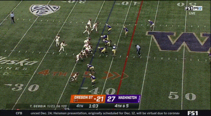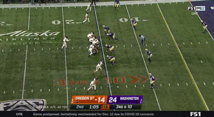 This play is well-defended by Washington, but Gebbia doesn’t make it too difficult for them to guess: Gebbia locks onto his first read and stares him down the whole way.