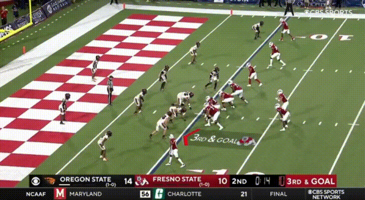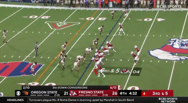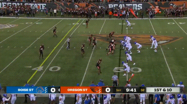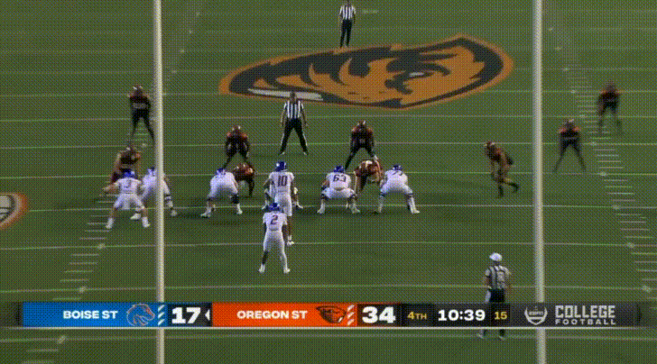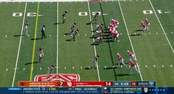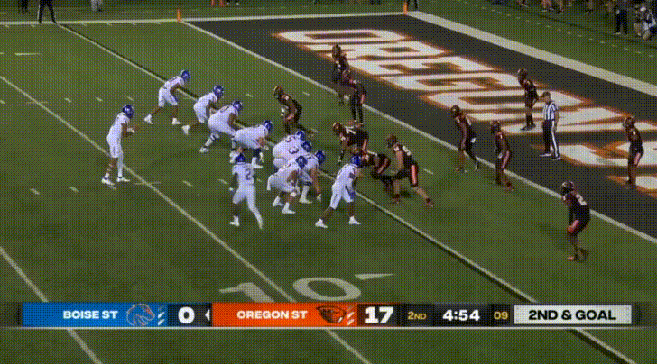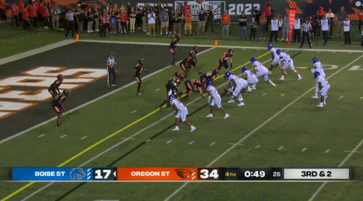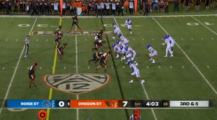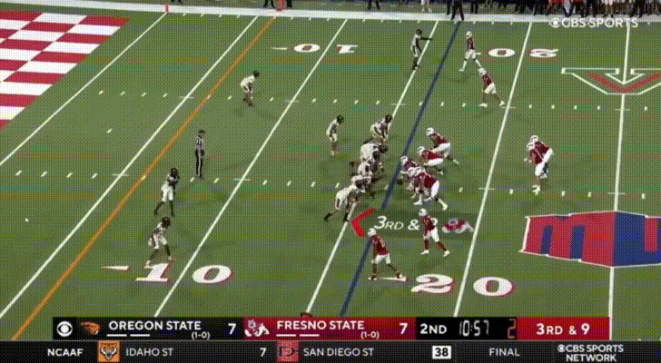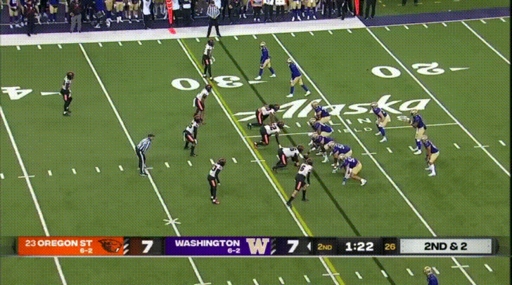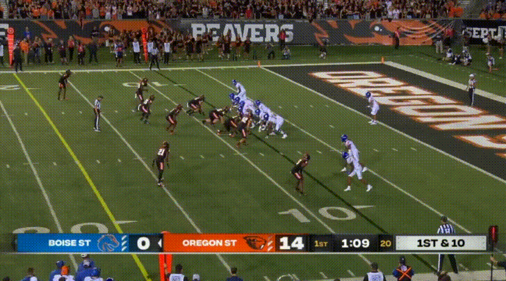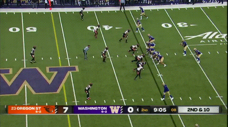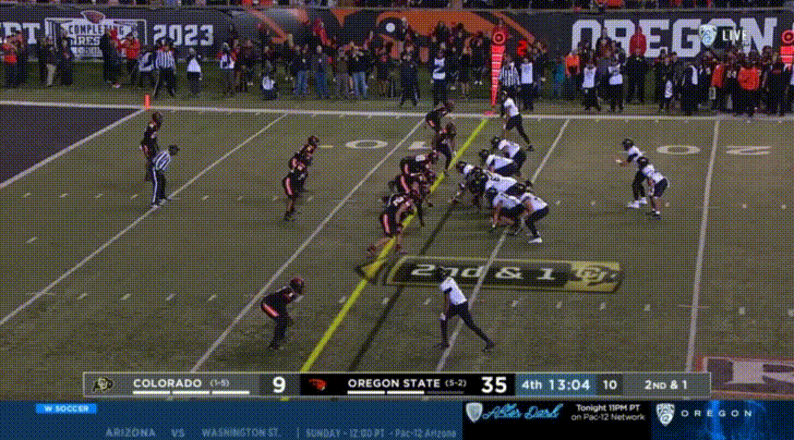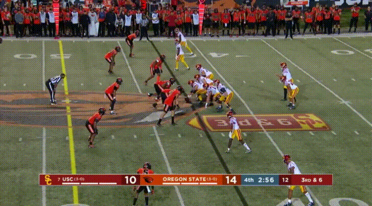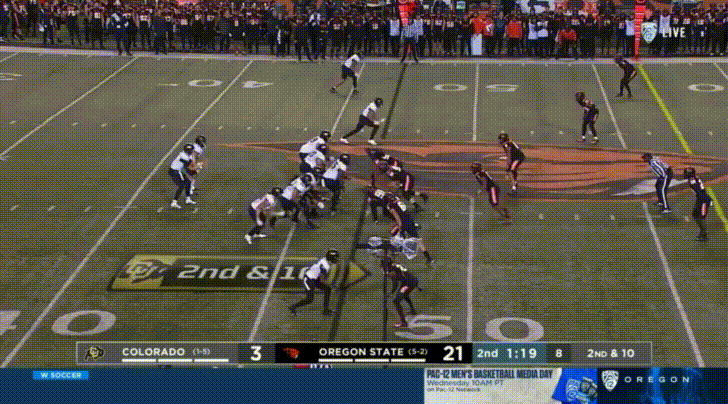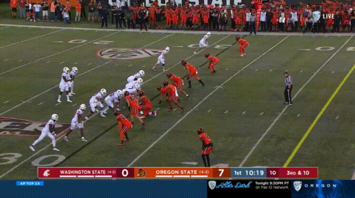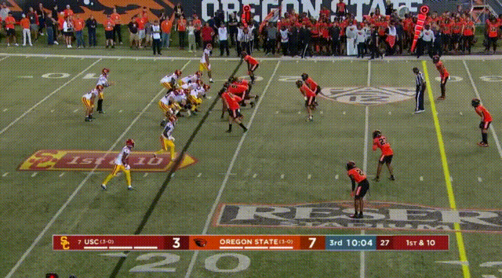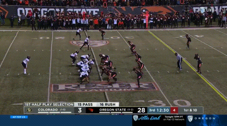 So I’ve been a little harsh on OSU’s defensive line, but the truth is that they’re about on par with Cal’s (albeit banged-up) defensive line. In OSU’s defense, I believe some of their defensive linemen suffered injuries in the preseason, and have perhaps been slow to find their stride. Here’s defensive end Isaac Hodgins’ only sack of the season (Hodgins broke his foot in the offseason):