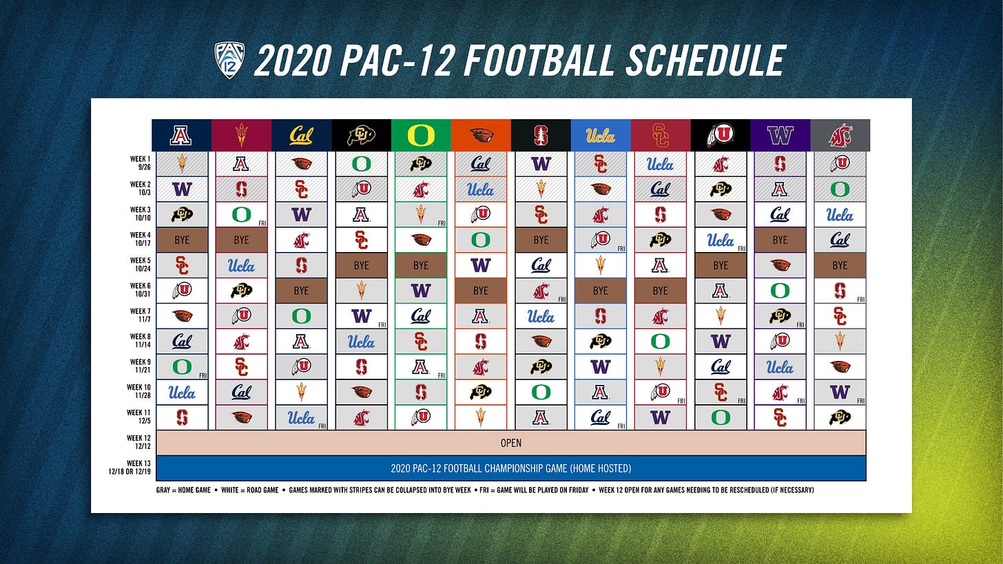 The Pac-12 announced the 10-game schedule that only includes in-conference games. The schedule allows for an open date in December so that games are able to be rescheduled if they need to be. Fall Camp is scheduled to start on August 17th, according to the Pac-12. The Bears would start their season by visiting Oregon State and then SC in Week 2. They would have their bye in Week 6.