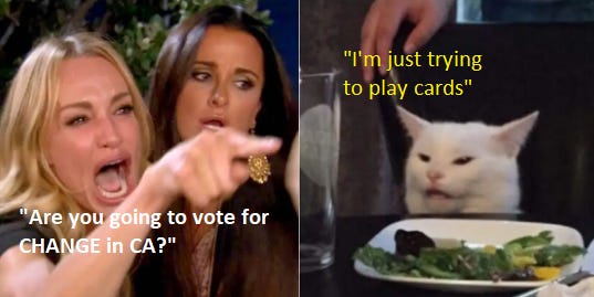 On Tuesday night, St. Mary’s beat Gonzaga in the WCC Finals. A very drunk and happy St. Mary’s mom was at a table I was playing at, along with a couple other PAC-12 and Gonzaga fans. She asked me in my Cal hat about how I vote and if was “Ready For a Change.” She went from happy drunk to angry drunk very quickly, and stormed off to go talk to her husband. Here is an artist’s rendition;
