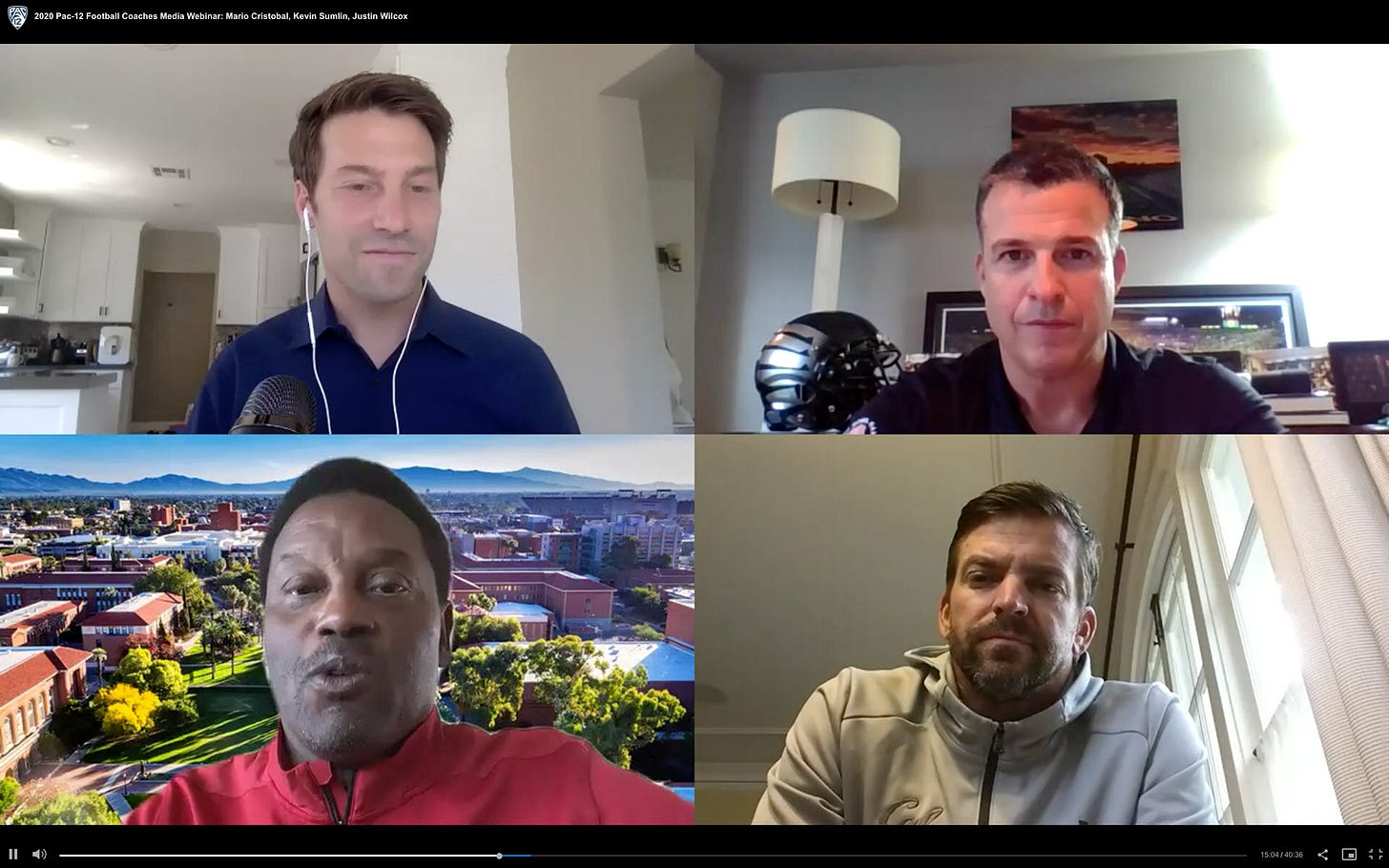 (Pac-12 Football Coaches Webinar, clockwise from right: Oregon Head Coach Mario Cristobal, California Head Coach Justin Wilcox, Arizona Head Coach Kevin Sumlin, Pac-12 Networks Football Analyst Yogi Roth)