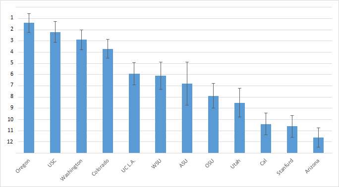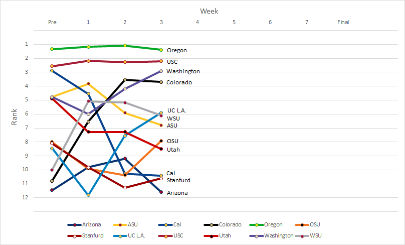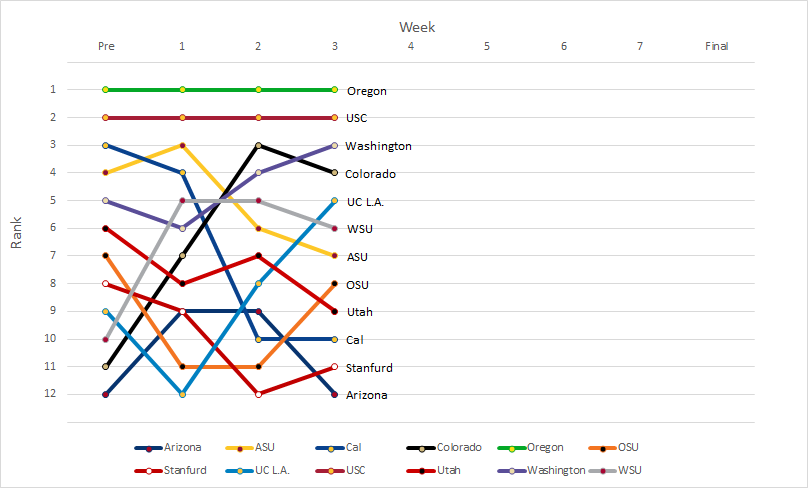 The responses for each team are combined and averaged to give the main rankings listed above. Figure 1 shows how these rankings have progressed over the season, with Oregon and USC holding steady at their top spots for the fourth-straight week. At the bottom of the ladder, Arizona shows some fearful symmetry by starting the season at twelfth, spending two weeks at ninth, and then coming back down to the bottom.