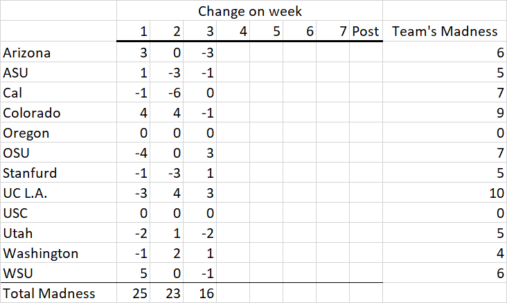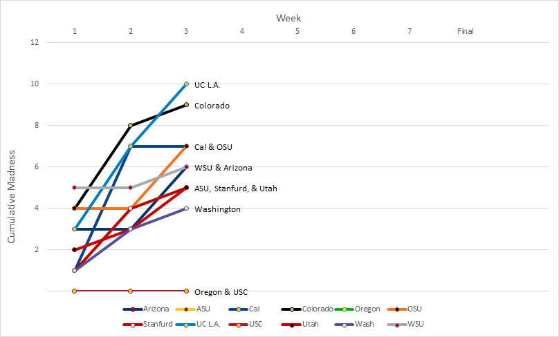 In Figure 2a, we’ve charted how many spots up and down the rankings each team has moved. Week 3 was the quietest week we’ve seen all season by a pretty healthy margin—a 30% decrease compared to Week 2. This is possibly an indication that we finally have enough data on most of these teams to have a fair assessment. These values are graphed in Figure 2b to show how each team’s total Madness is changing over the year. USC is one of two teams with a Madness score of 0—which in and of itself is mad as USC typically exhibits high Madness due to their unique combination of elite talent, mind-boggling inconsistency, and underwhelming coaching.