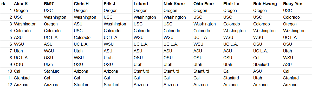Ruey Yen (2): I had Colorado at second last week. The good performance by UCLA just made that win look even more impressive. A lot is on the line this weekend when USC and Colorado play for the control of the Pac-12 South.