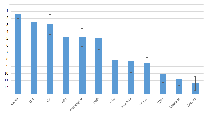 The columns in this figure represent the precise score that each team achieved. The error bar represents 1 standard deviation, which tells you how varied we responded for each team. California has a large standard deviation/error bar because we received votes as high as first (lolwut) and as low as fifth (also a slight lolwut). Teams with small standard deviations (e.g., USC and UC L.A.) received more consistent responses.