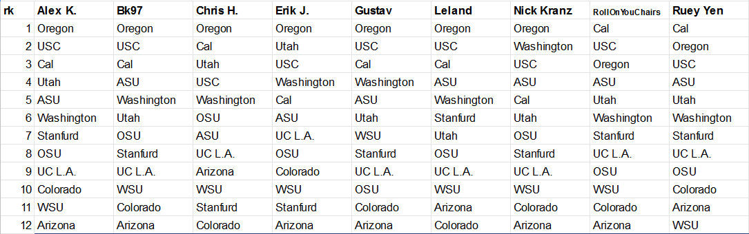 Furthermore, I’m quite surprised to see that we collectively not only split the conference in two, but where we put that divide. The aforementioned near-threeway-tie at fourth has a precise score closer to 5.0; the next teams (a cluster of Oregon State, Stanfurd, and UC L.A.) have precise scores at 8.0—a whopping drop of three spots. Despite some collective indecision about how to rank ASU, Washington, and Utah, the group felt that OSU was clearly in the next tier.