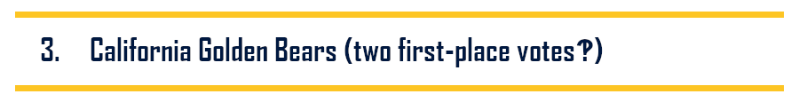 RollOnYouChairs: Since it’s the preseason, Cal gets the #1 spot. After that, I went mostly with ESPN’s preseason FPI, with a bit of editorializing based on coaching transitions. The preseason FPI goes U$C (#13 nationally), Oregon (#14), Utah (#24), Stanford (#28), Washington (#29), Cal (#30), ASU (#41), UC L.A. (#49), WSU (#54), Colorado (#56) Arizona (#63), and OSU (#67).