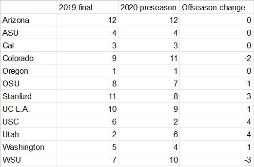 A whopping seven teams either didn’t move spots or moved just one spot—suggesting either a lot of continuity from last year or a group of writers who are too scared for big hot takes in our predictions. That being said, we did project large improvements of three and four spots for Stanfurd and USC (respectively), predicting that they will improve after tough 2019 seasons. Conversely, our rankings have drops of those same magnitudes for Wazzu and Utah, teams that are looking to regress after a coaching change and a significant loss of talent. Coaching changes weren’t universally linked to significantly falling down our rankings—Colorado only dropped two spots (although maybe that’s more of an indictment that there isn’t much further they can go) and Washington managed to gain a spot for an internal hire coupled with relatively underperforming last year.
