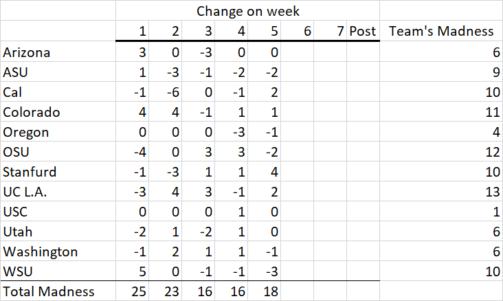For all of the movement up and down the rankings, Figure 2A shows these gains and losses as the Madness score for each team. The biggest riser and faller match with their on-field results from this weekend—the Cardinal’s big upset win and the Cougars’ humiliation. There’s no clear frontrunner for the Maddest team of the year, but USC continued to build on their lead as the least Mad team—will they be able to hold onto that title for the rest of the season?