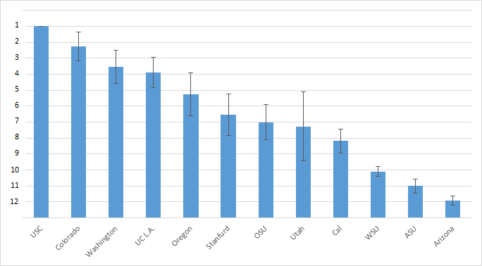 Taking a step back, our individual votes (Table 1) are converted into one unified ranking by taking all of the scores that we gave a team and finding the average, which actually reveals a little more information about how much agreement we—as a group—had in our evaluations. The averages are collected as columns in Figure 3; the error bars represent one standard deviation. A small standard deviation means we were in high agreement—the Trojans have no error bar because they were our unanimous top team. The Utes have a huge standard deviation because they received votes all across the board—as high as fourth and as low as ninth.