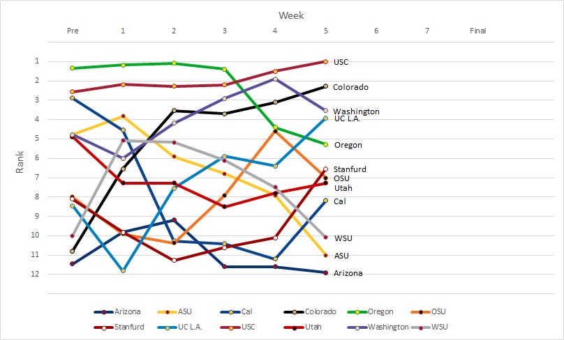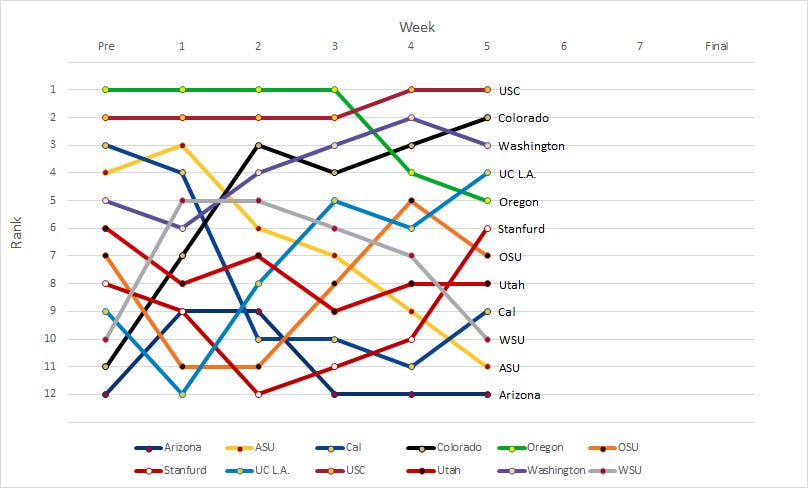 Nick Kranz: I’m going to be honest, I didn’t put a ton of effort into my rankings this week. As much as I get a giggle from trying to compare an ASU team with two games played to an Oregon State team with five (common opponents: nobody), this season is so over-the-top absurd that pretending to make sense of it is clearly farce.